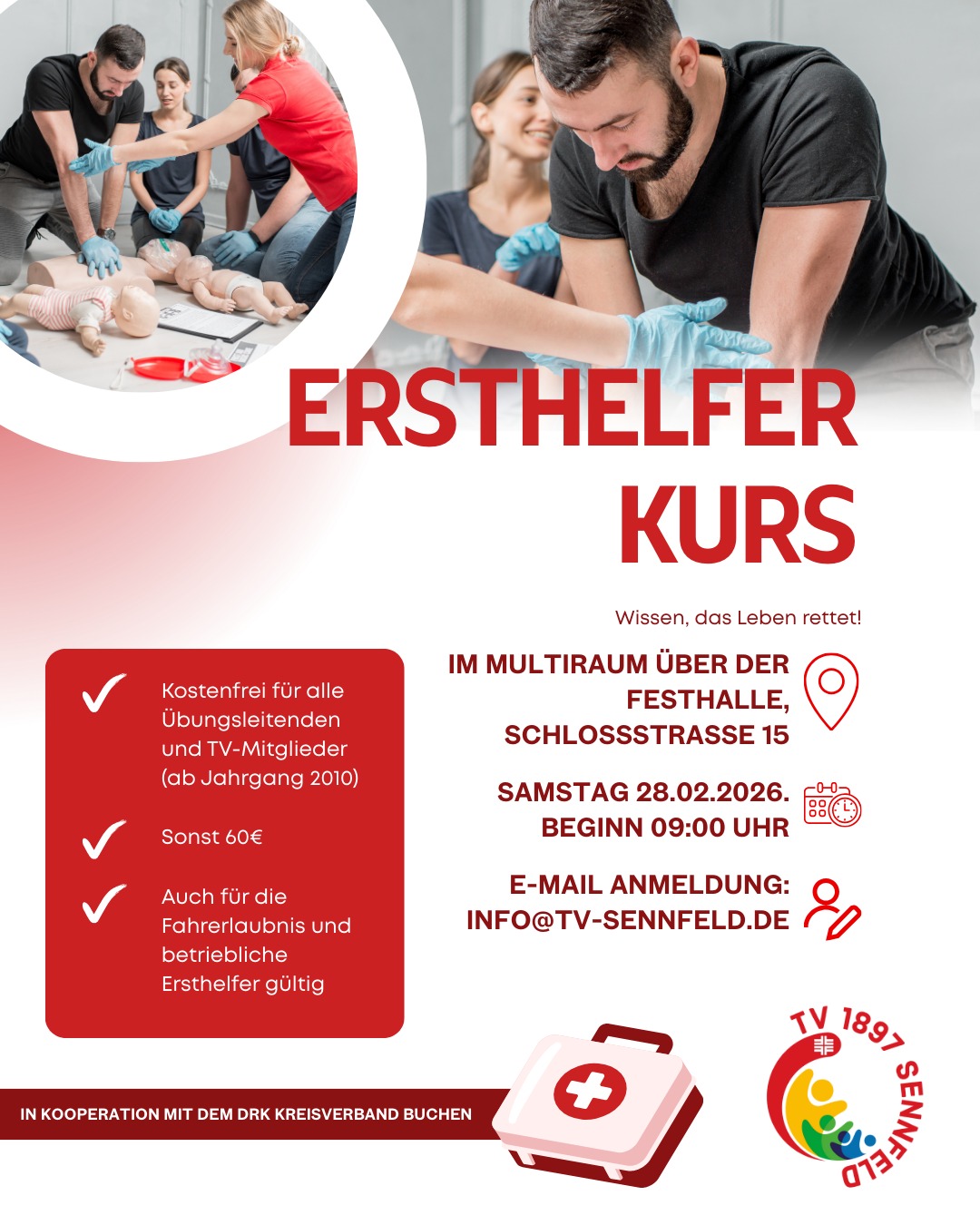 Samstag 28.2.26, ab 9 Uhr im Multiraum des TV. Auch für den Führerschein und betriebliche Ersthelfer gültig. In kooperation mit dem DRK Kreisverband Buchen, E-Mail Anmeldung an info(at)tv-sennfeld.de